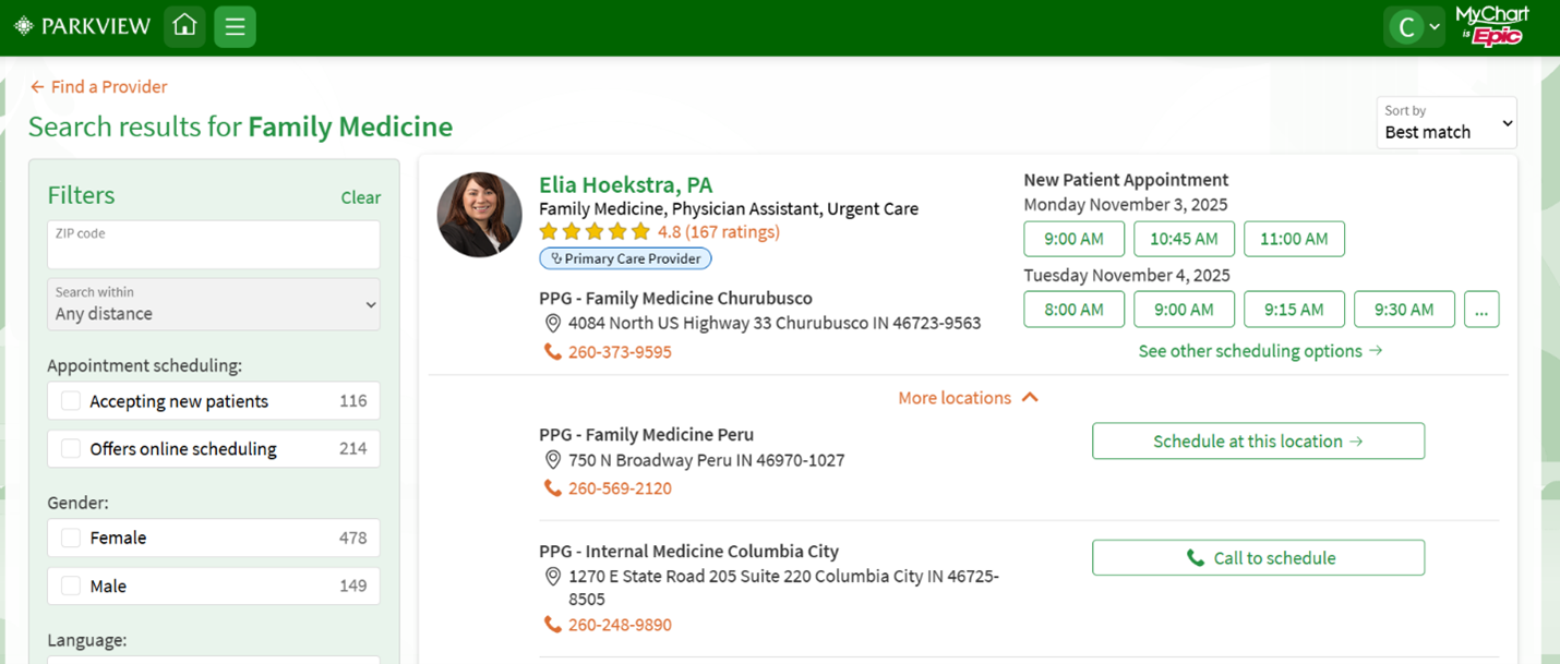 When it comes to your health, finding the right care shouldn't be complicated. Whether you're searching for a new primary care provider, a specialist, or simply the next available appointment, Parkview MyChart now makes it easier than ever to connect with the care you need — all in one place. The new Provider Finder feature in MyChart helps you search, compare and schedule with confidence. With just a few clicks, you can explore Parkview providers and choose the one that's right for you — based on what matters most to you.